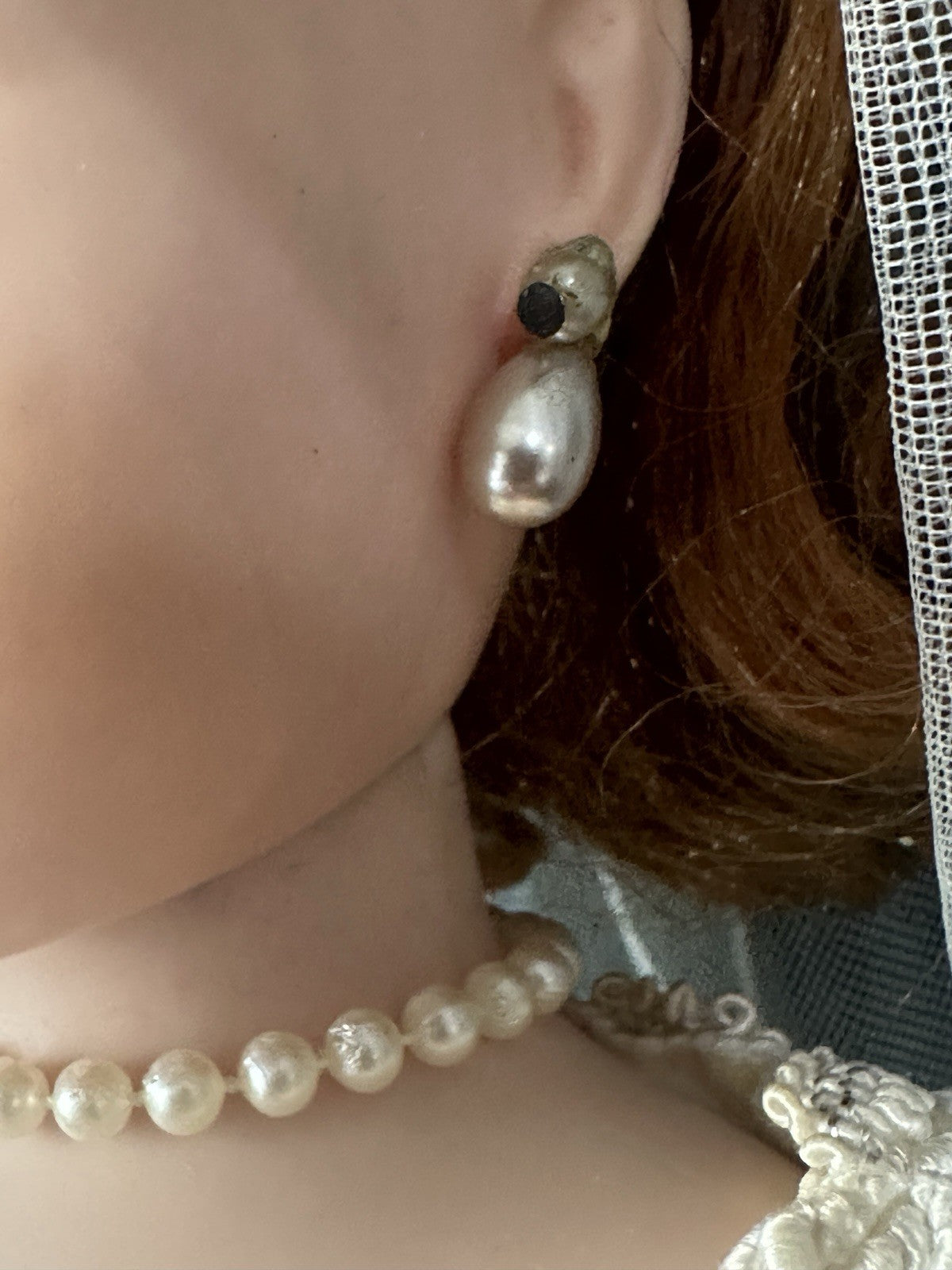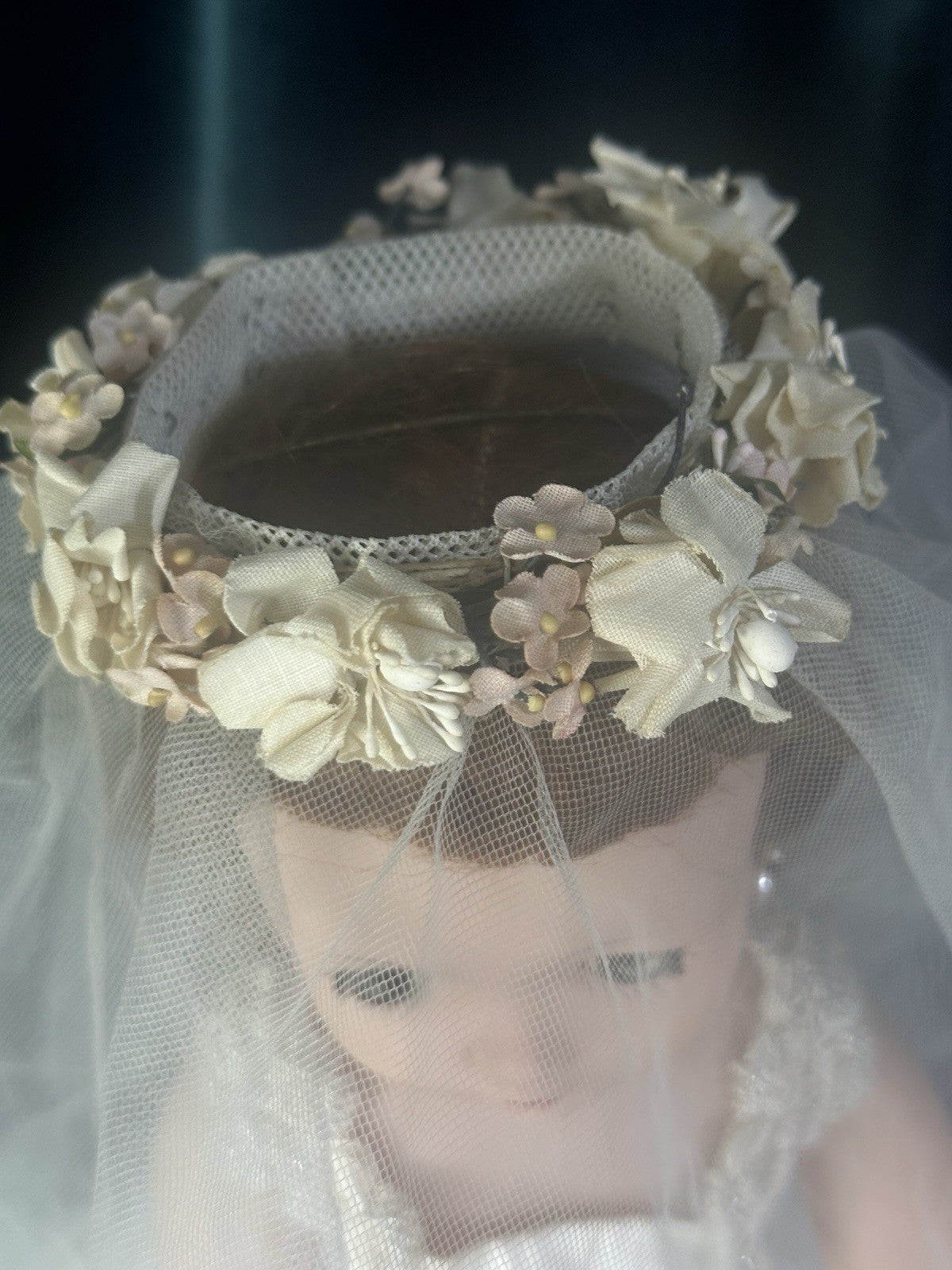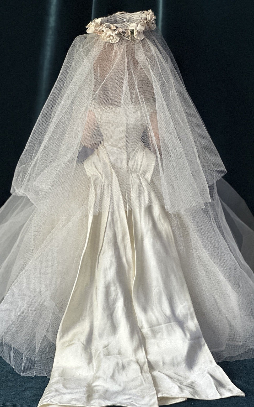 Original tagged bridal gown. Shoes, stockings and veil are original as well. Some holes are present to her stockings and tulle to her gown. We are not sure if all of her jewelry accessories are original.