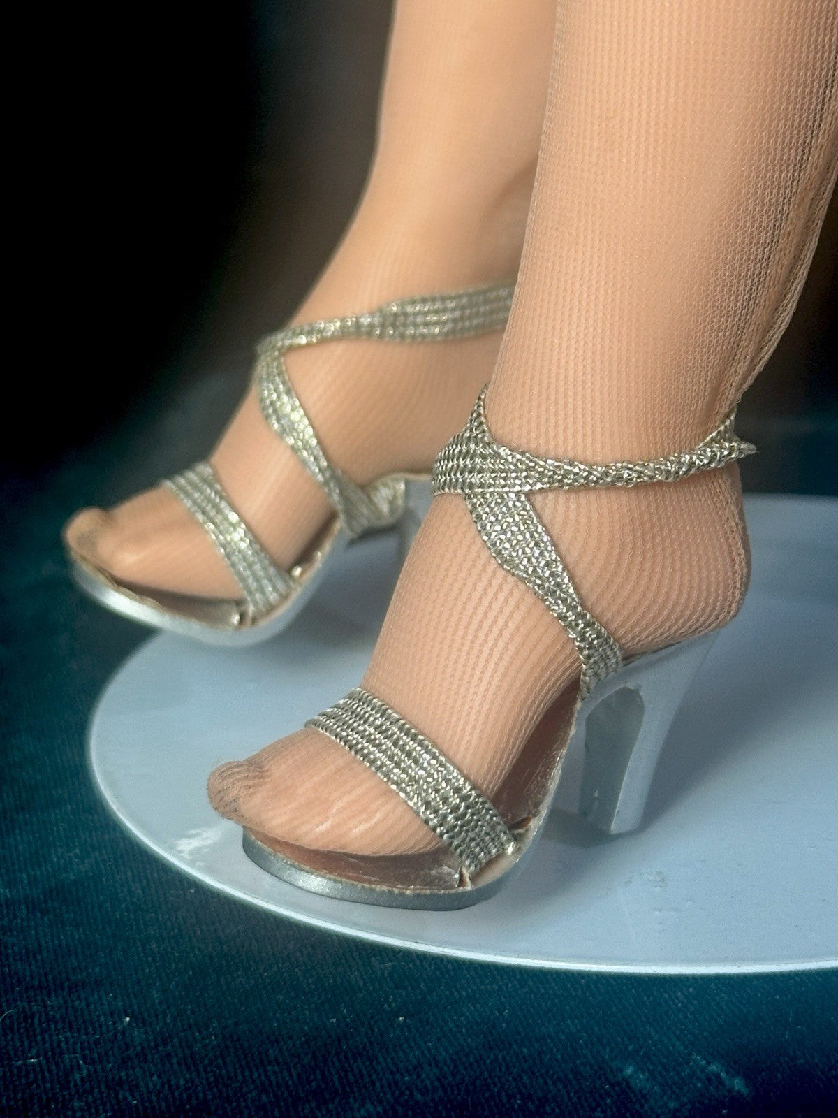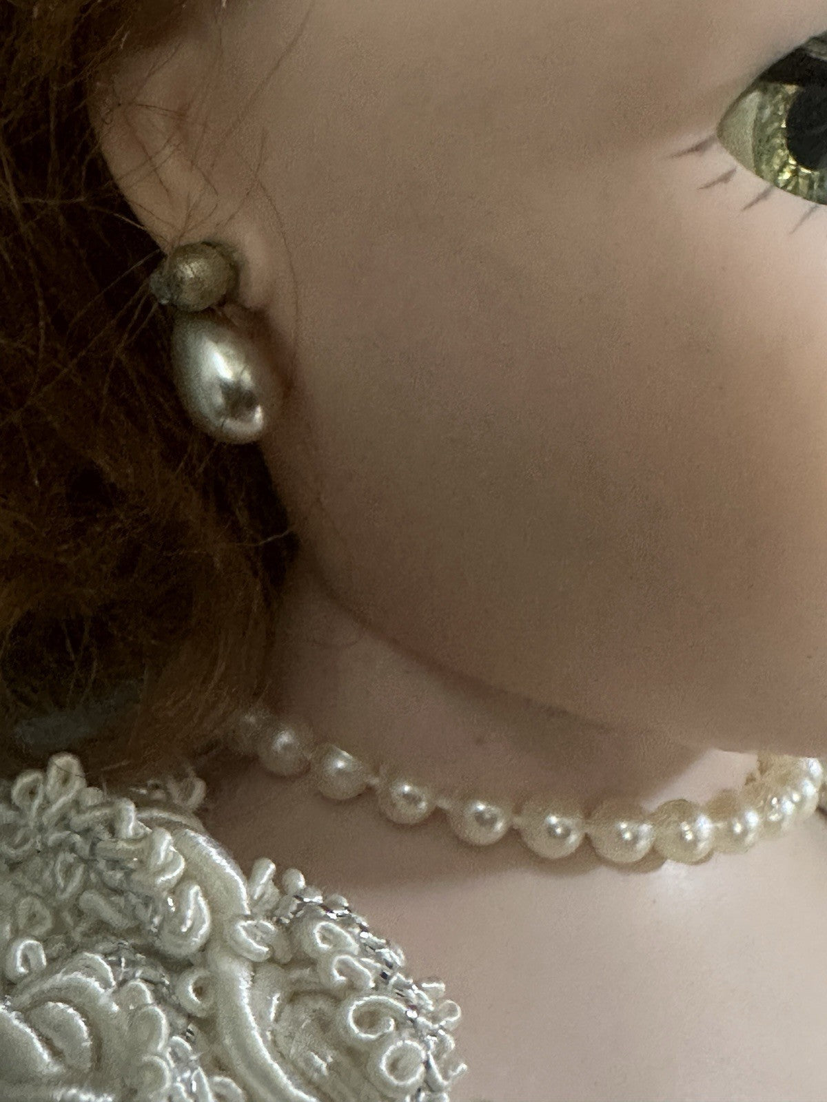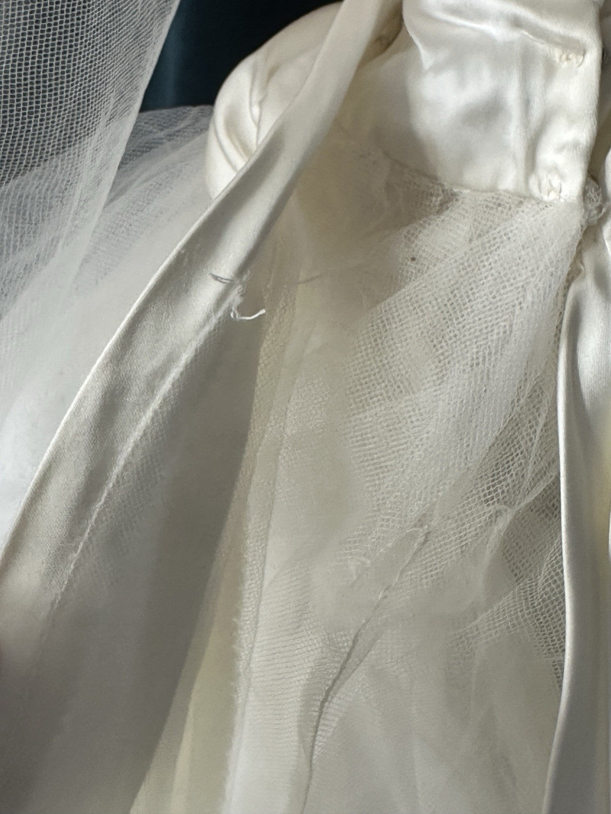Original tagged bridal gown. Shoes, stockings and veil are original as well. Some holes are present to her stockings and tulle to her gown. We are not sure if all of her jewelry accessories are original.
