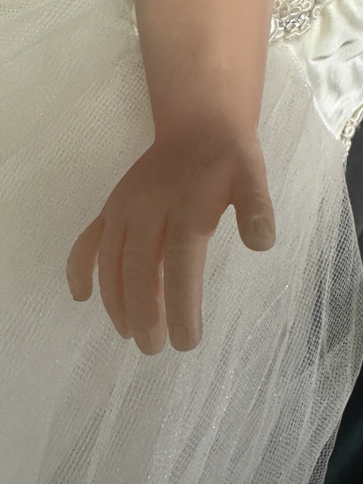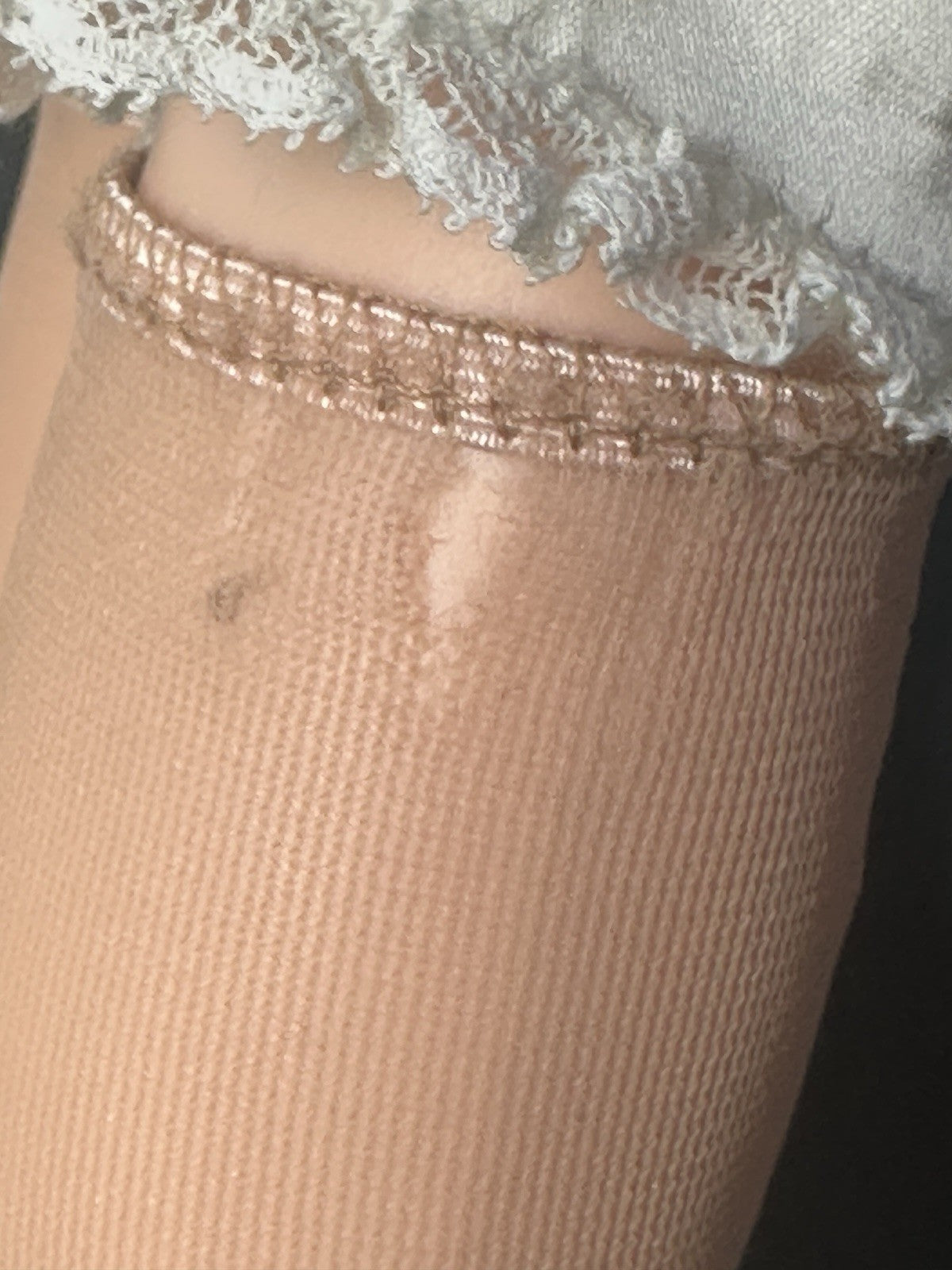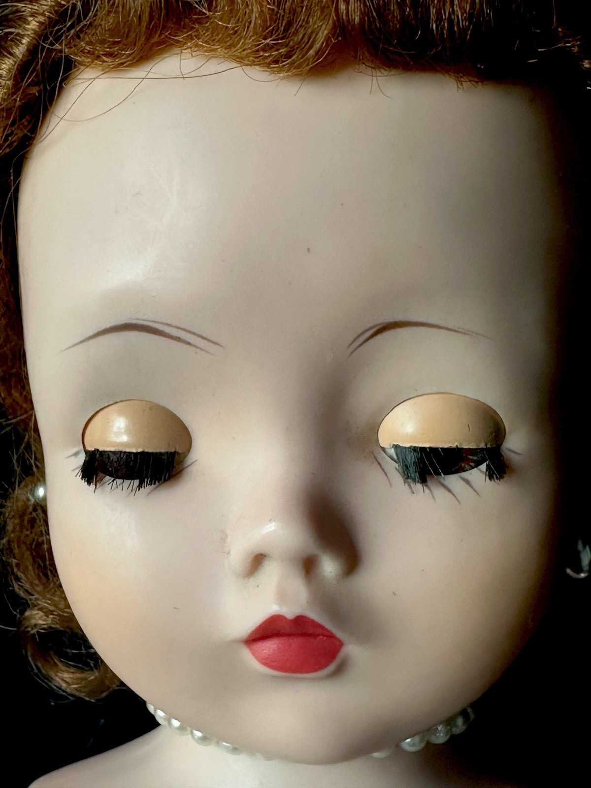 Face paint is well preserved. Sleepy eyes mechanism is working. Missing some eyelashes. Wig is glued; glue residual to the sides of her head under the wig.