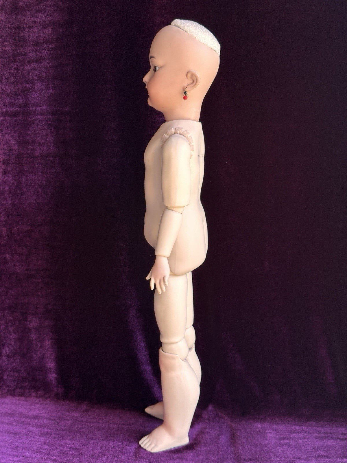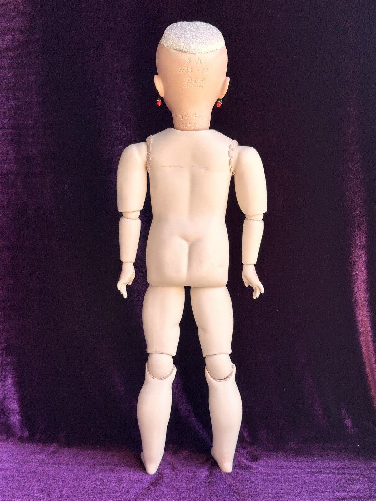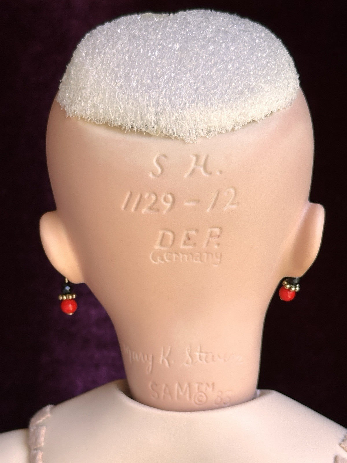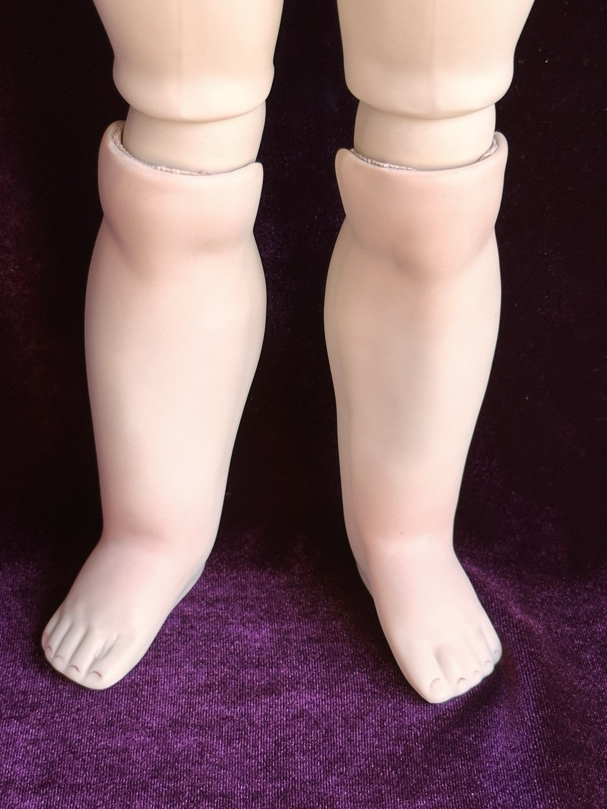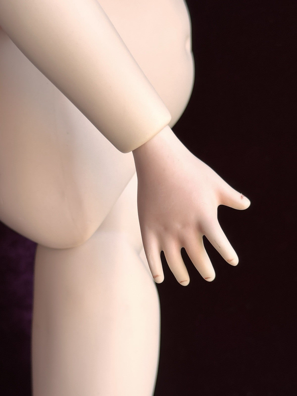 This beautiful doll is made entirely of porcelain, including her body. She has no damage and is in great condition overall, with just some light marks from the stand that appear to be removable. The doll has good stringing and poses well.