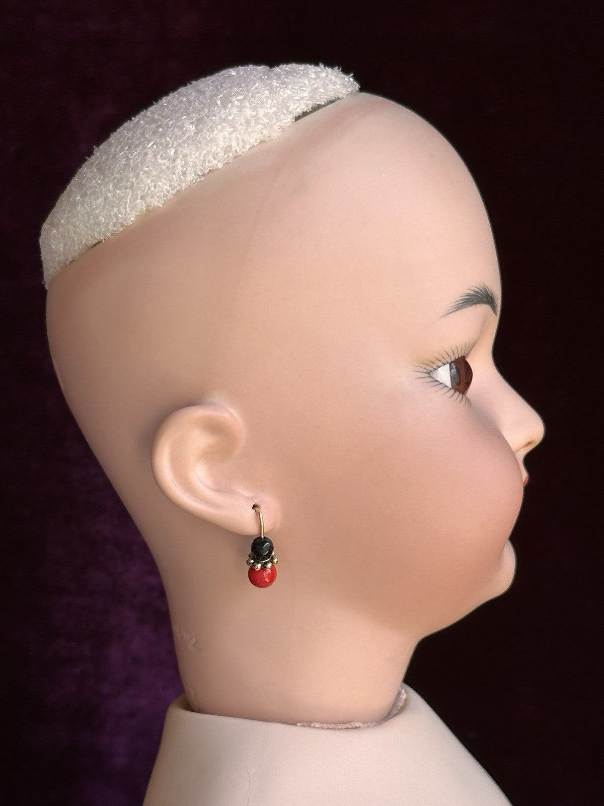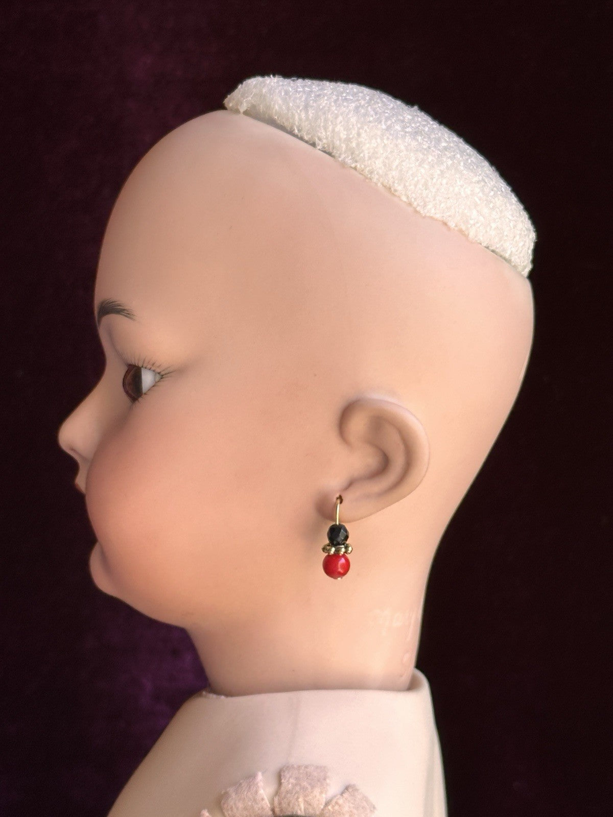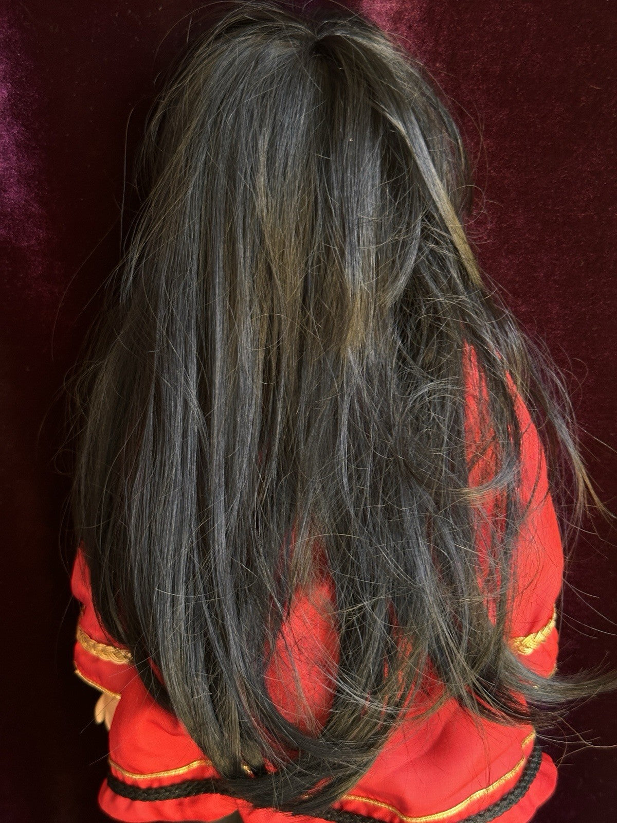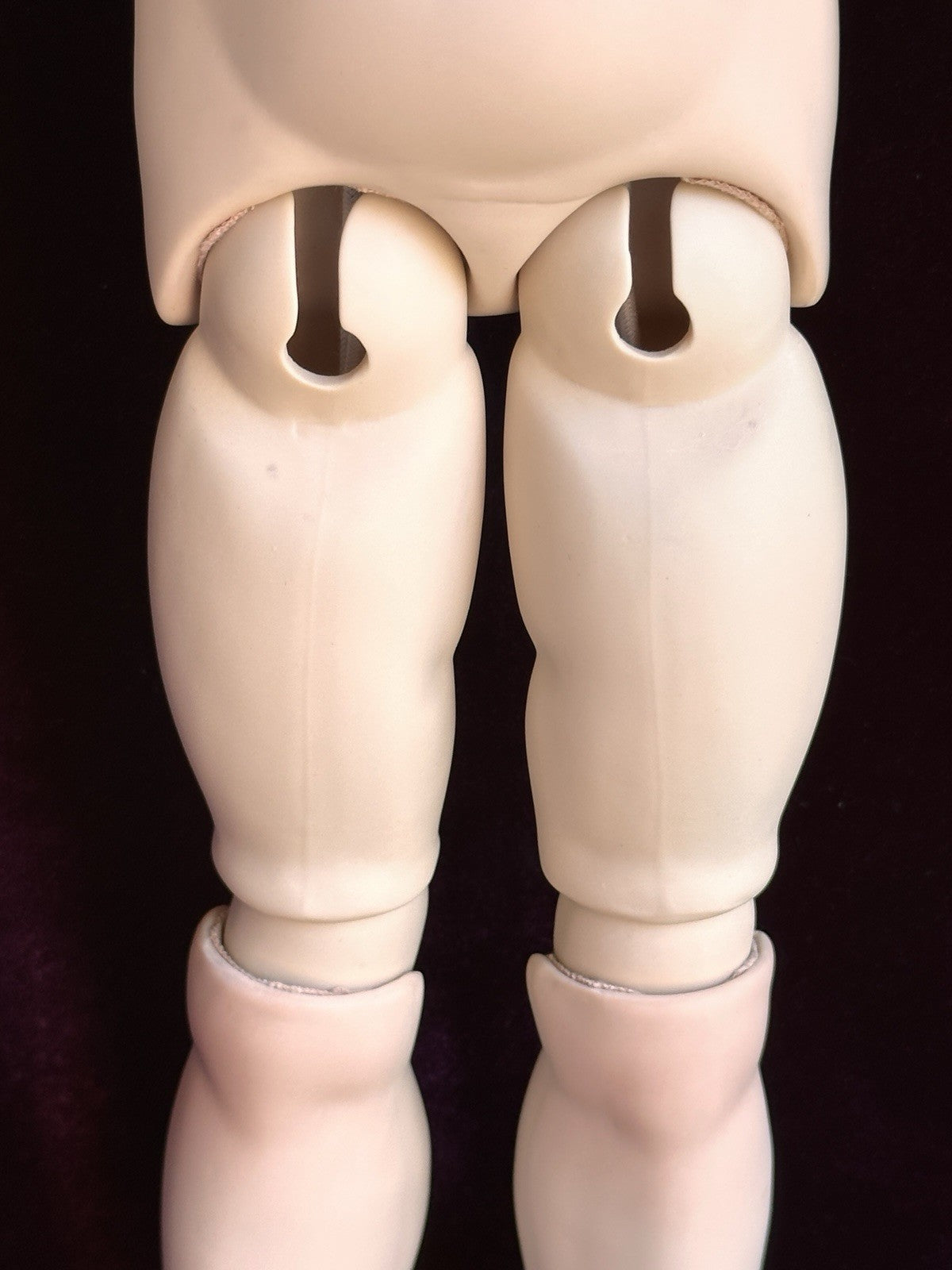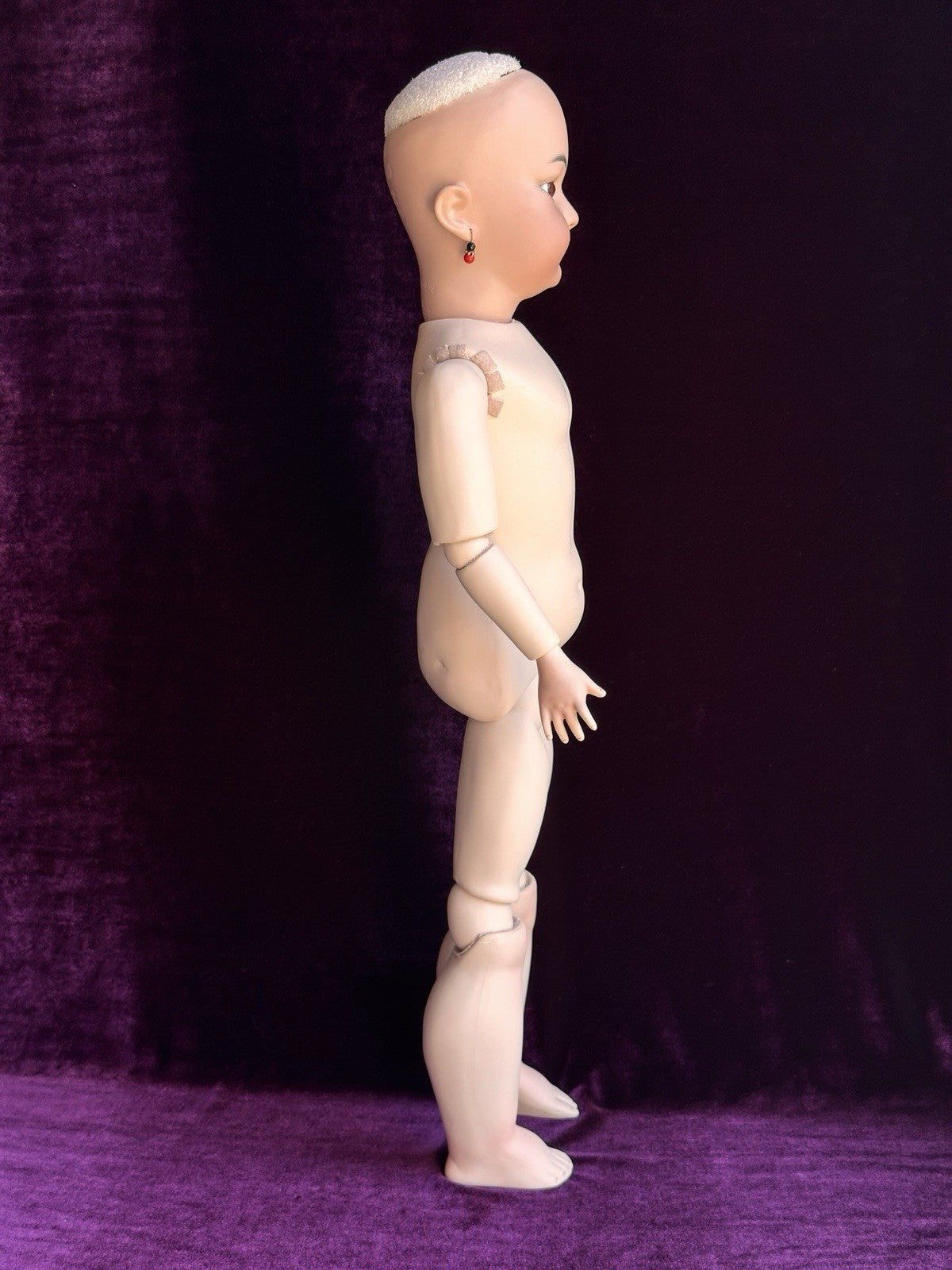 This beautiful doll is made entirely of porcelain, including her body. She has no damage and is in great condition overall, with just some light marks from the stand that appear to be removable. The doll has good stringing and poses well.