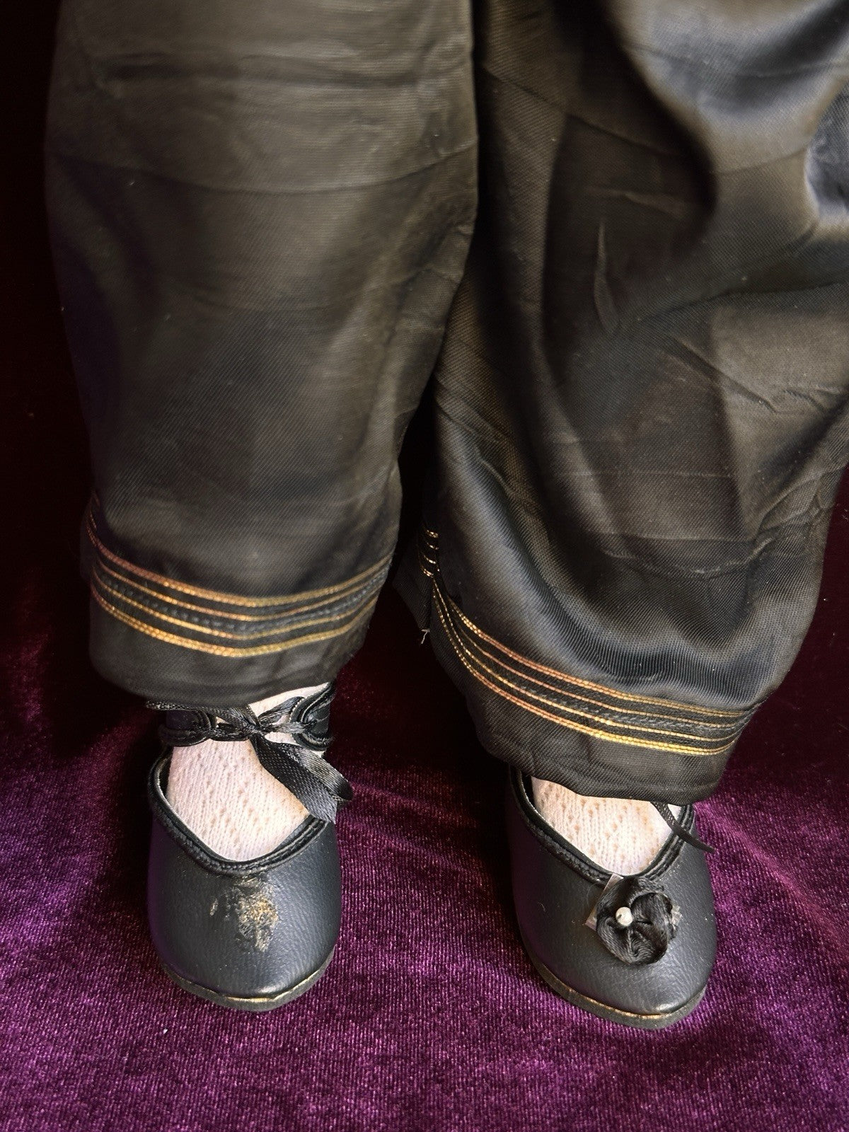She is dressed as shown in the photos. The shoes show some wear, including a missing decoration on one of them. The hair is a little bit messy. The doll is signed and dated by the artist.