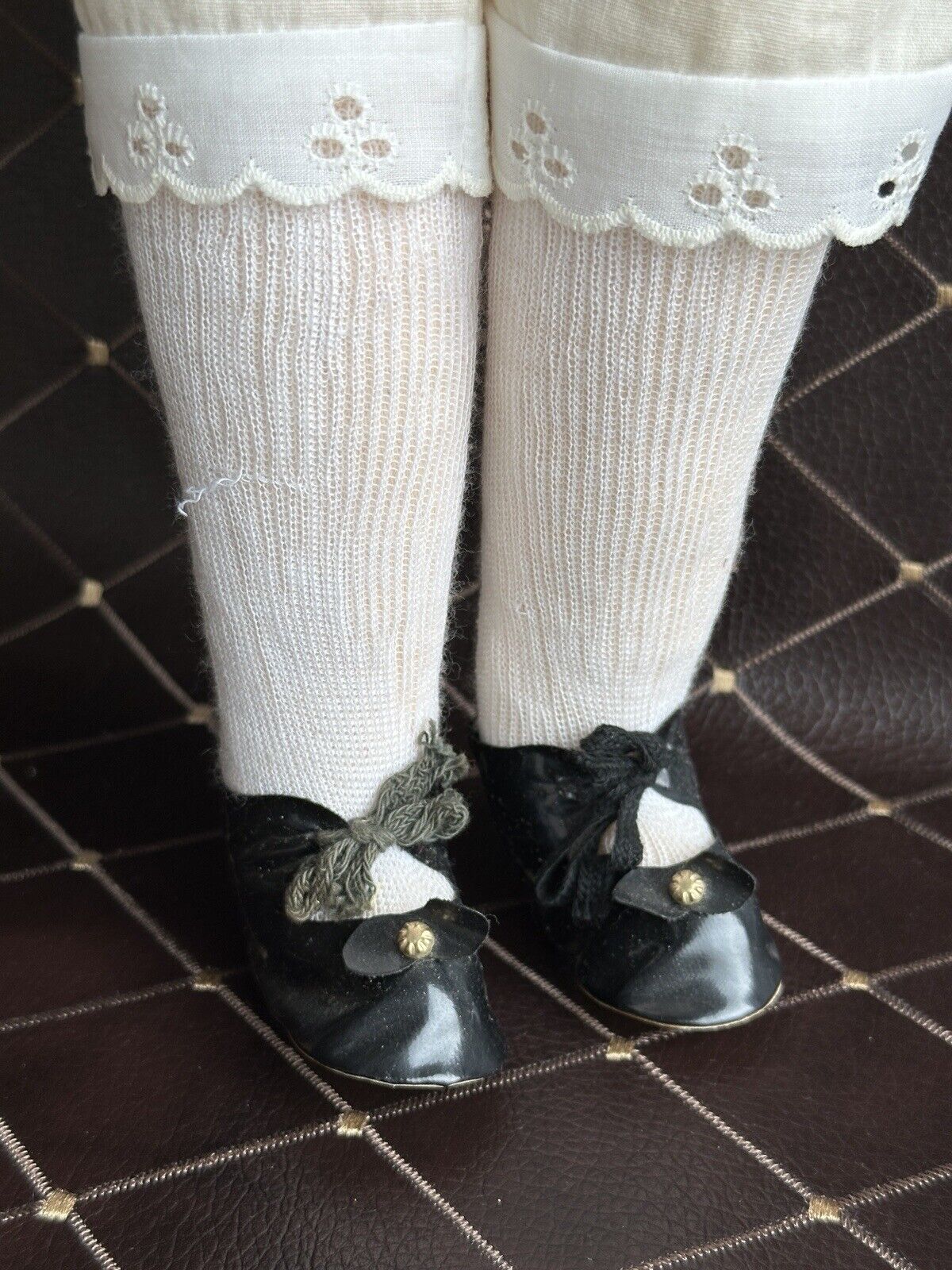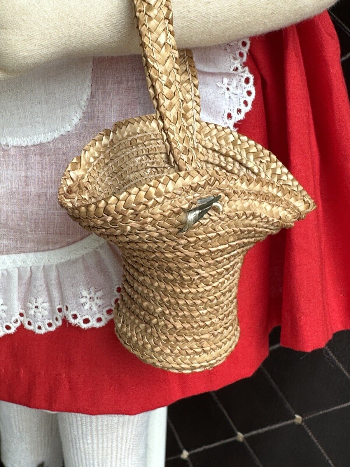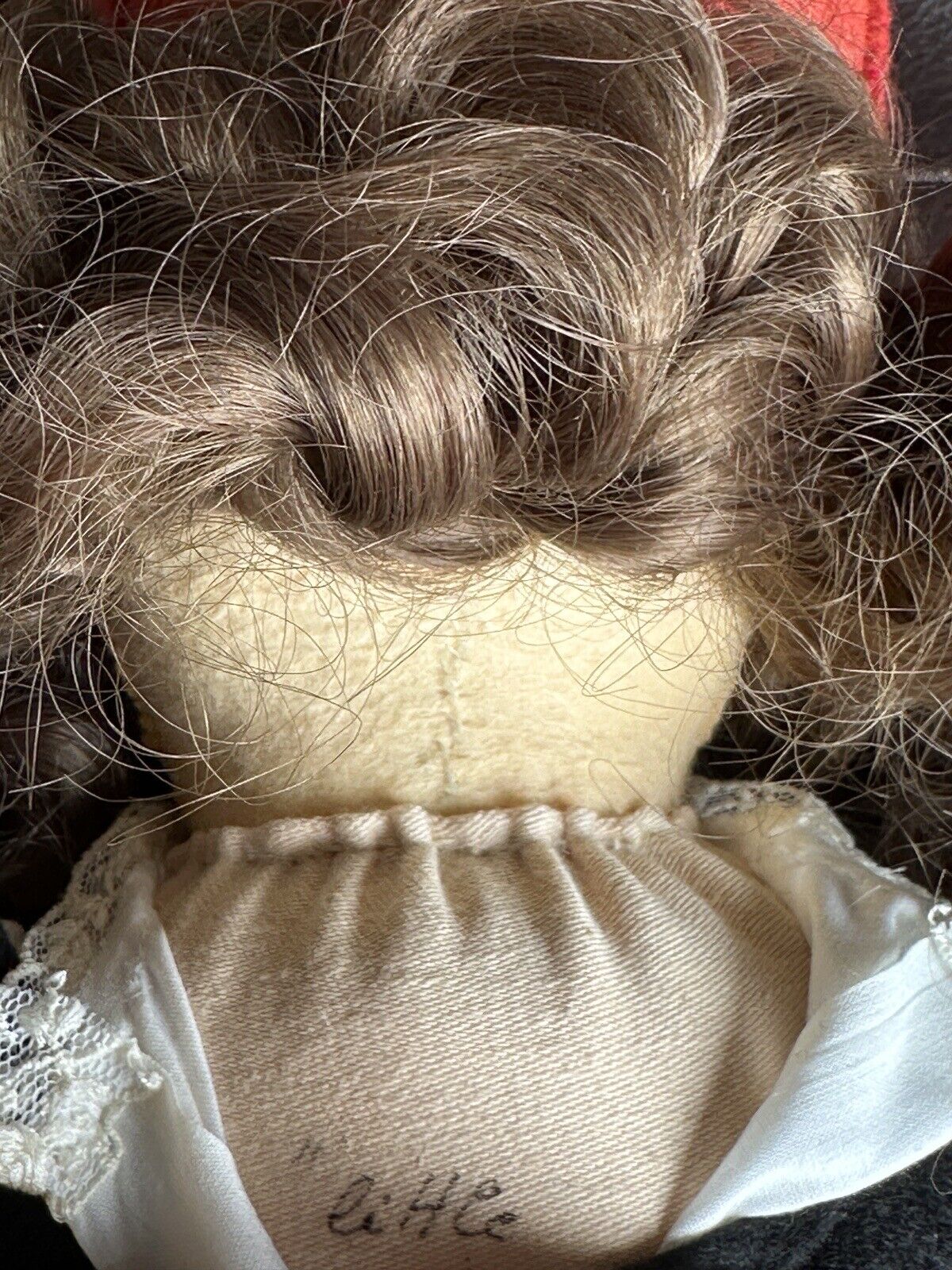 This very sweet old doll has felt face. All other parts are made of other fabric. She is signed, numbered and dated on the back. Despite the age the doll is in good condition, but shows some light signs of wear. There is a small stain by her right eye. Looks like there are some dark spots also in the area of hair. Tiny stain to the left arm. Yellowish color to the apron. No other flaws are found. The basket is not original to the doll. It is included with the doll. No stand to the doll. No tag. Please refer to the pictures for more details.