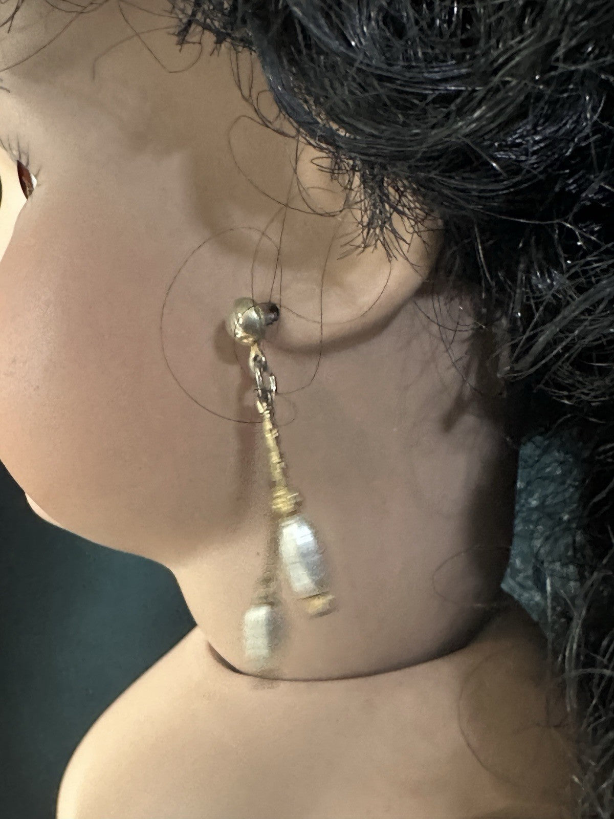 Beautiful reproduction of French Bru Jne doll!! Marked on the back of her head. She is about 13" tall; all porcelain. Stationary brown eyes. Nice face painting. Synthetic curly hair wig. Glued to her head. Pierced ears with earrings. Stringing is good but she can't strike a pose.