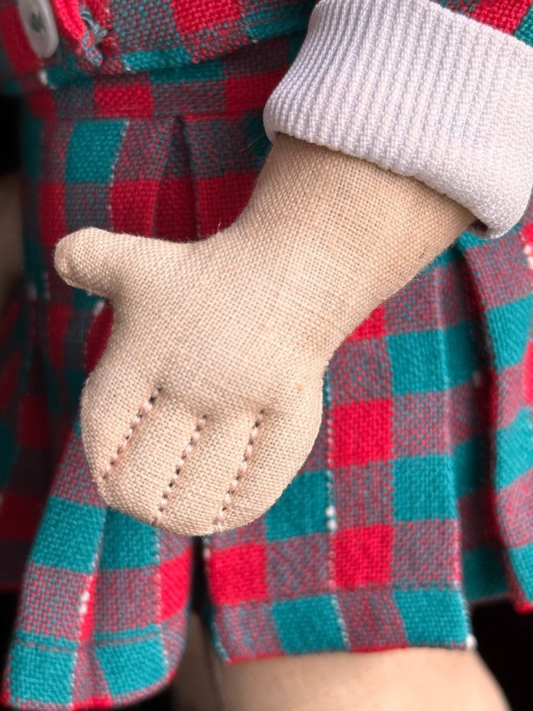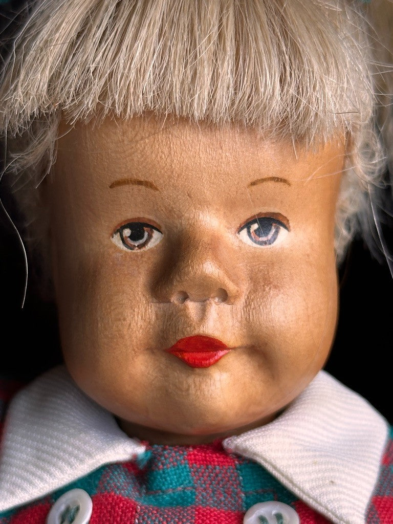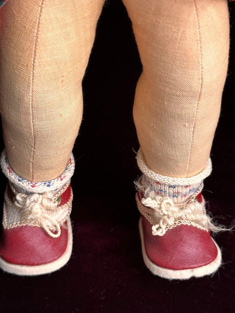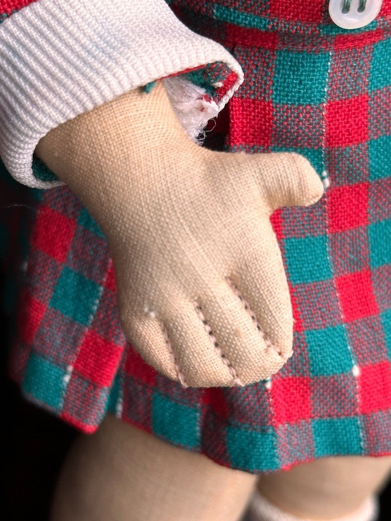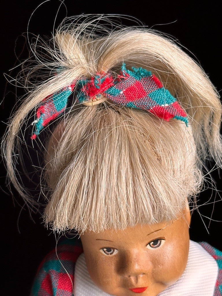This very cute doll is all original and is in great condition. No wear was found. She is clean and ready to be displayed. The doll has a wood-carved head and the rest is cloth. She is beautifully dressed. The doll has no tag.