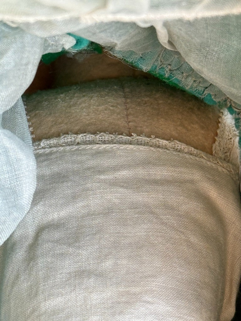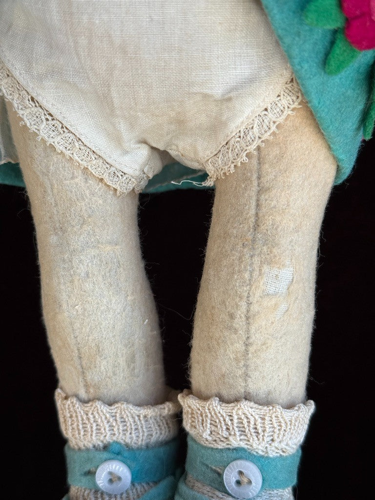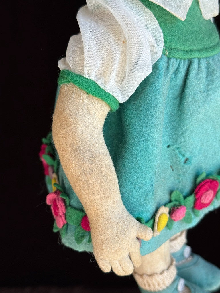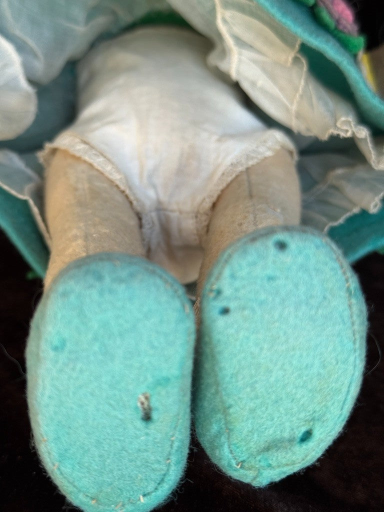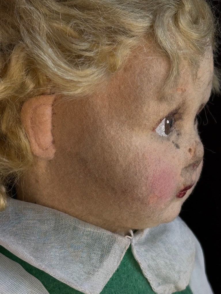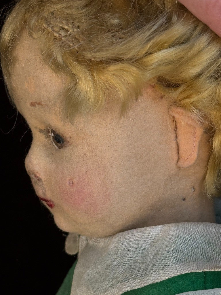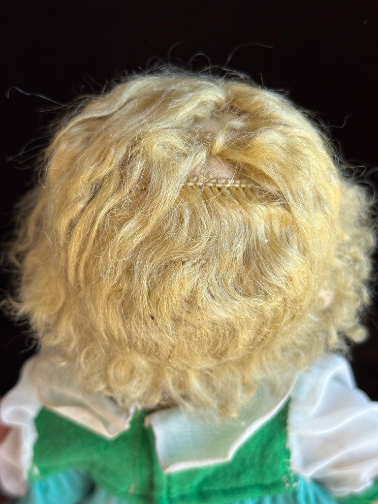 Adorable doll showing noticeable wear, as seen in the photos. This includes stains to the face, holes to exposed areas such as the legs, arms, clothing, and some areas of the hair. All details are clearly shown in the photos. Despite the wear, the doll remains very charming and displays beautifully. All parts of the doll well attached and move properly.