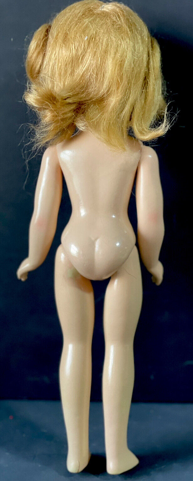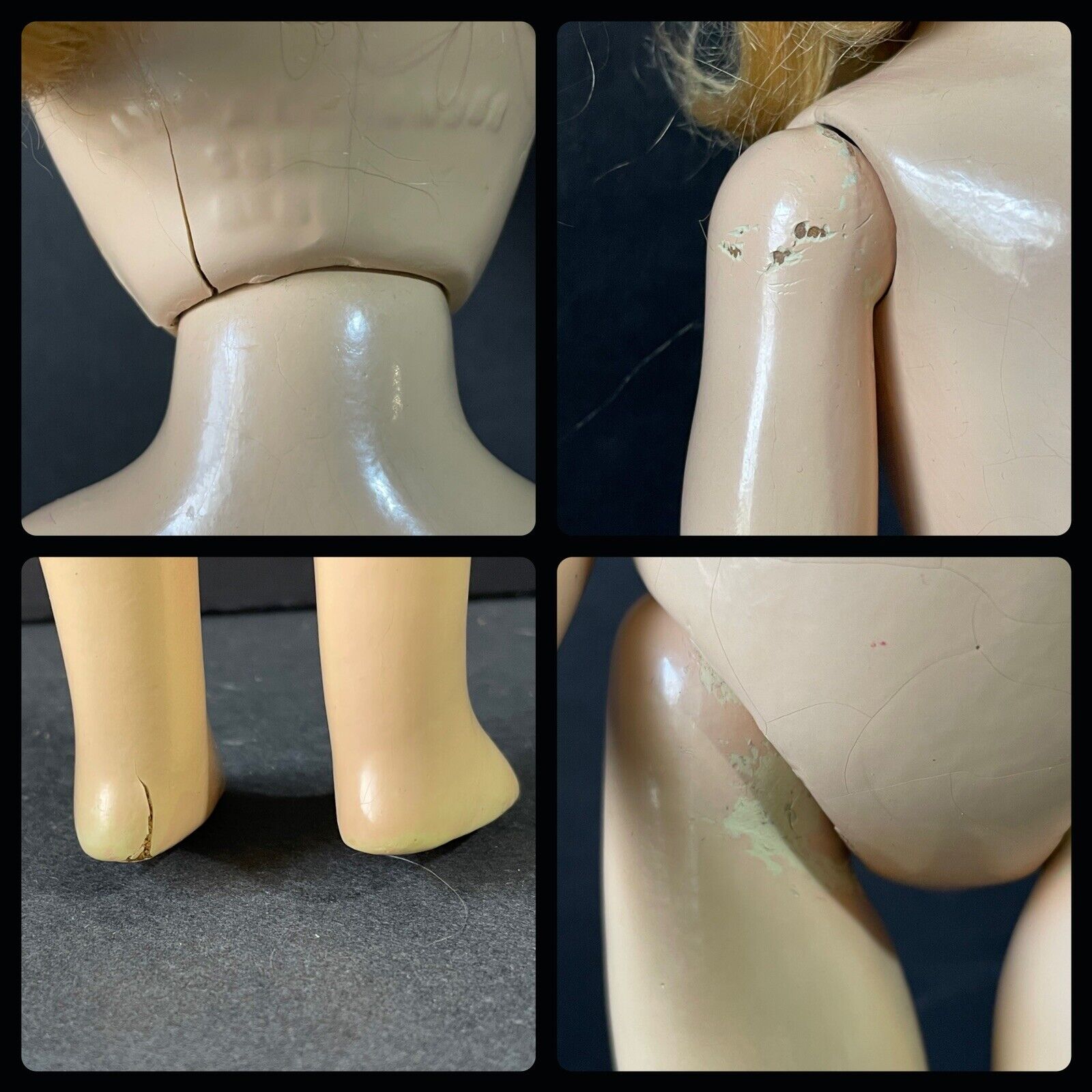 Face and body have some crazing and flaking. Sleepy eyes mechanism is working. Eyes are cloudy. Full upper real lashes. Paint loss to her face. Her wig seems to be an original but is shedding.