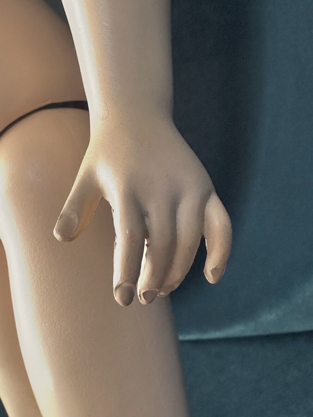 Face paint is well preserved but there are some marks (she needs some cleaning). Slight plastic odor might be present. Sleepy eyes mechanism is working. Eyes are clear. Full upper real lashes.