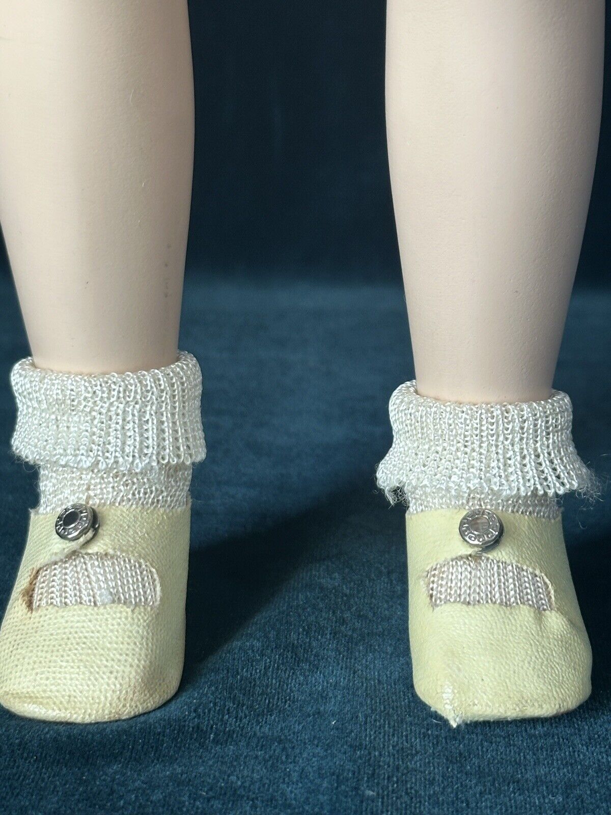 She is a walker doll - her head turns from side to side when her legs are moving. Body has few marks - see all photos. We are not sure if it was repainted. Her outfit is not original except possibly underskirt and undergarments. Some stains/holes are present . Stand and dog are not included