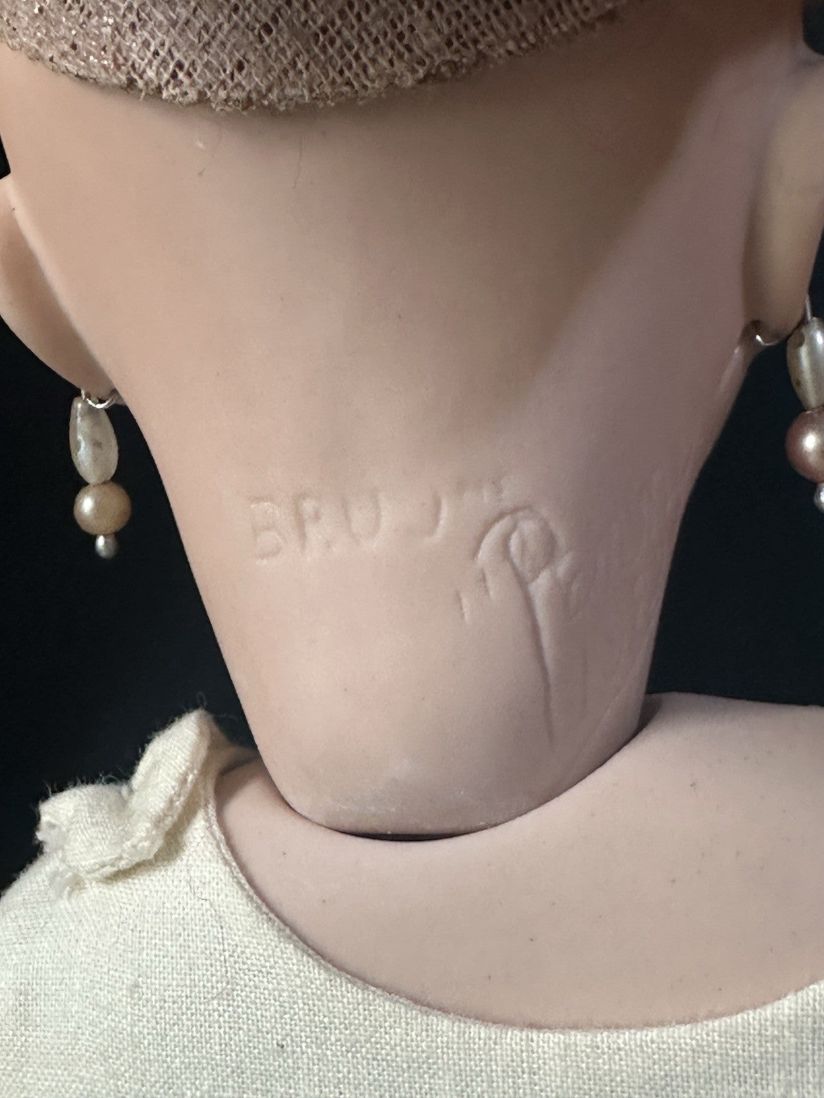 Beautiful reproduction of French Bru Jne doll!! Marked on the back of her head; signed and dated by the artist. She is about 14" tall; porcelain head and breast plate and partial extremities. Stationary brown eyes. Nice face painting. Beautiful wig. Pierced ears with earrings. Comes with beautiful outfit. We were unable to remove her undergarment pantaloons.