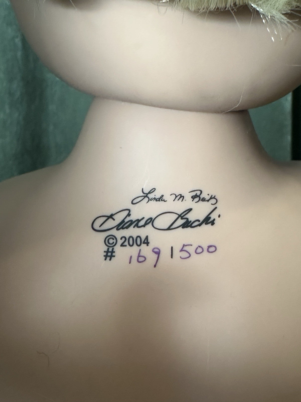 Beautiful doll by Linda Rick and Diane Buchi!! Her name is Emma and she is a limited edition of 500 dolls only!! Marked and signed on her back. She is approximately 27" tall; hard to measure due to her bent legs. Has to be displayed in a sitting position only. She has vinyl breast plate, partial legs and arms. The rest of her body is stuffed cloth. Beautifully painted face; stationary green eyes.Comes with her original clothes; we are not sure if she is missing any accessories. Comes with tag. Has some marks to her arm- not sure if removable. Chair is not included.