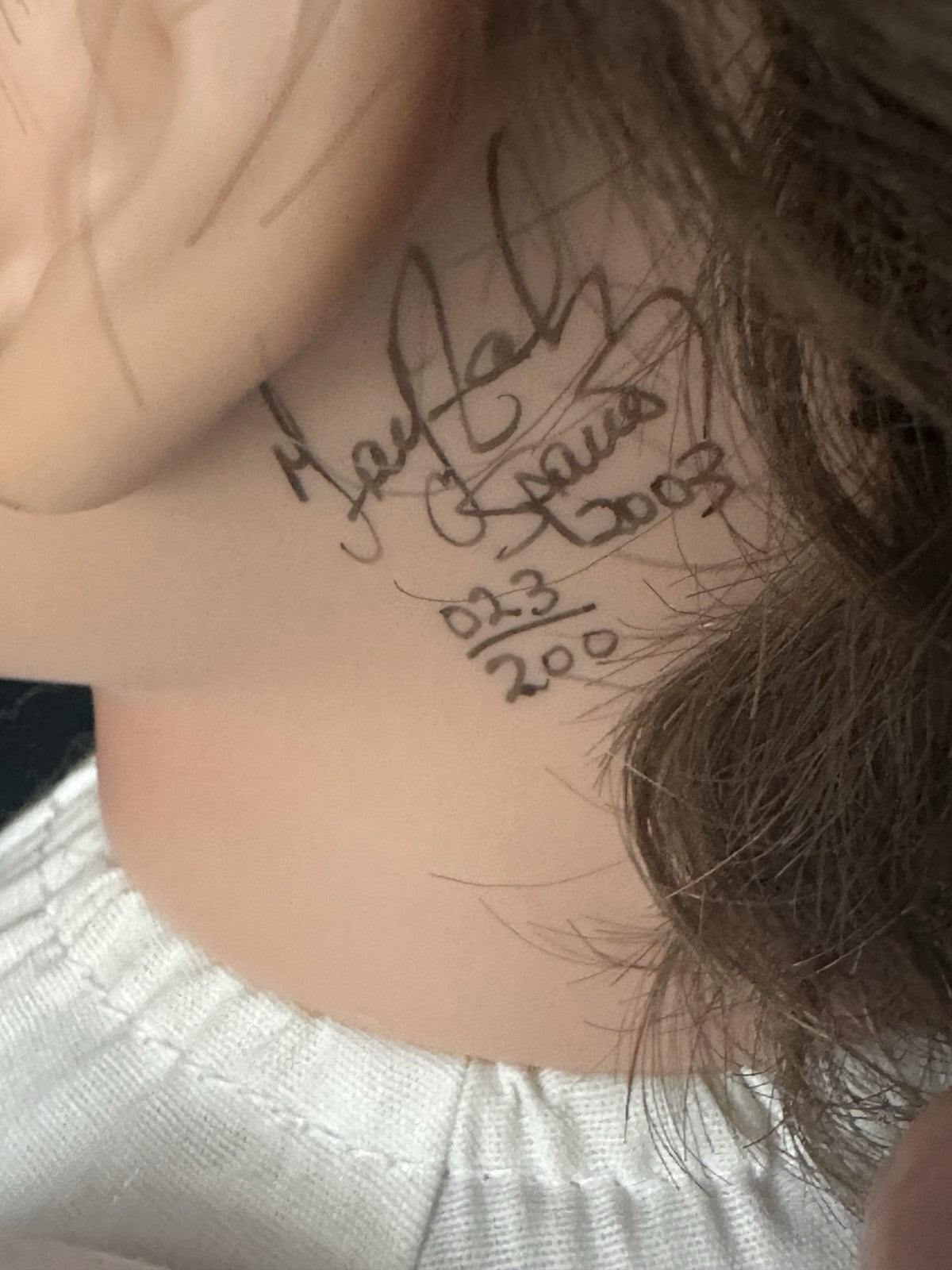 Adorable little girl doll by Fayzah Spanos! She is a limited edition of 200 dolls only. "Pre-School Prissy" is approximately 24" tall considering a bent knees. Has to be displayed in a sitting position only. Vinyl flange head and partial extremities. Beautiful face with stationary green eyes and real upper and lower lashes. Some minor stains are present to her clothing. No box or COA. Comes with a tag. Chair is not included but is available- let us know if you would like to have it.