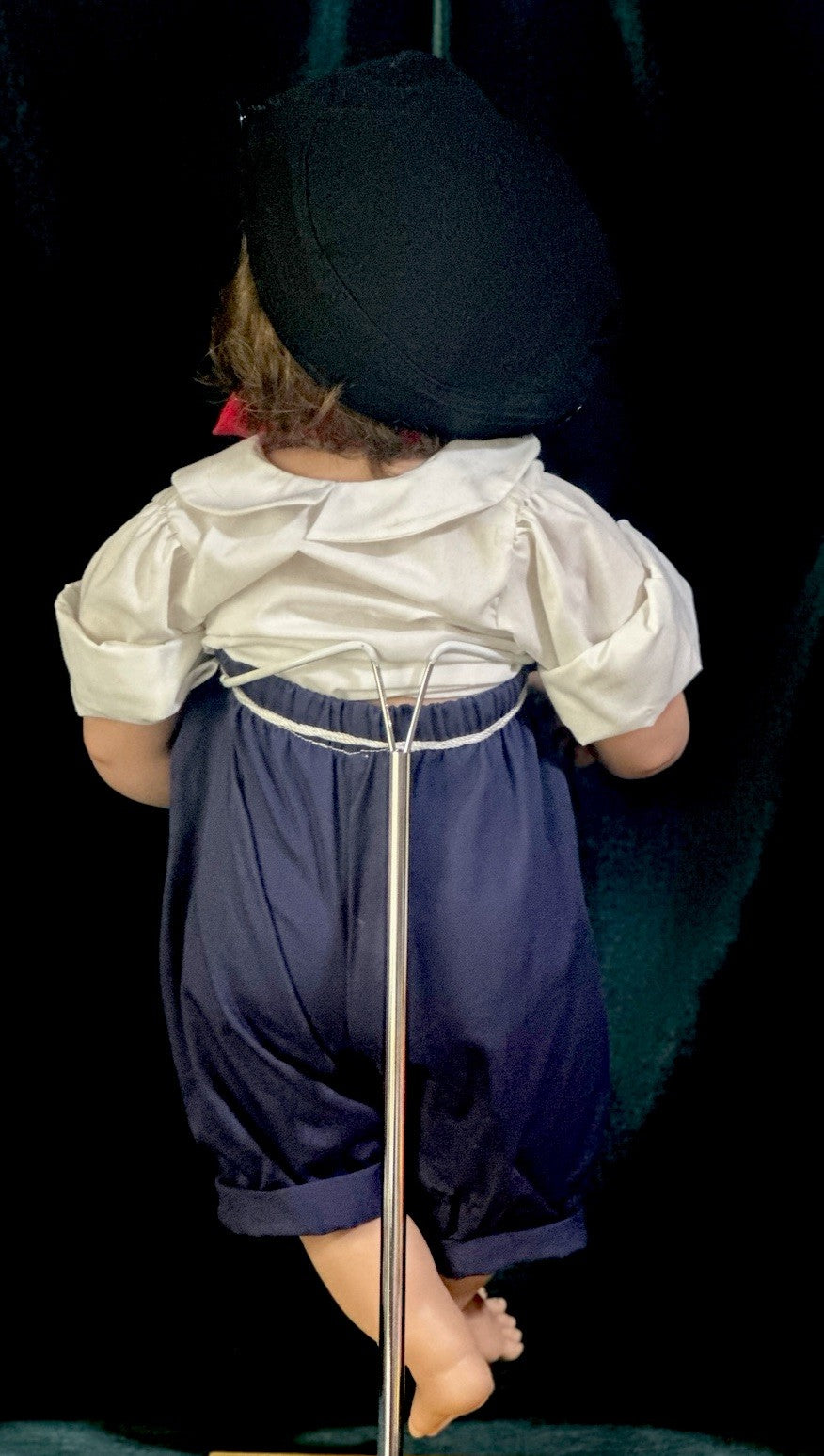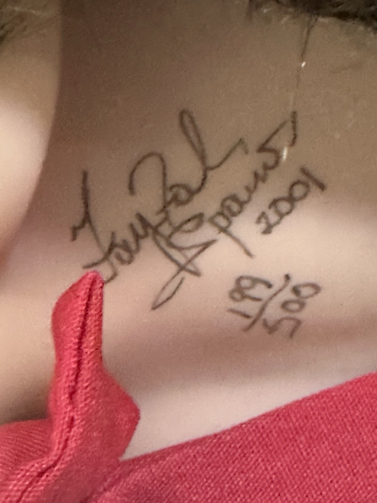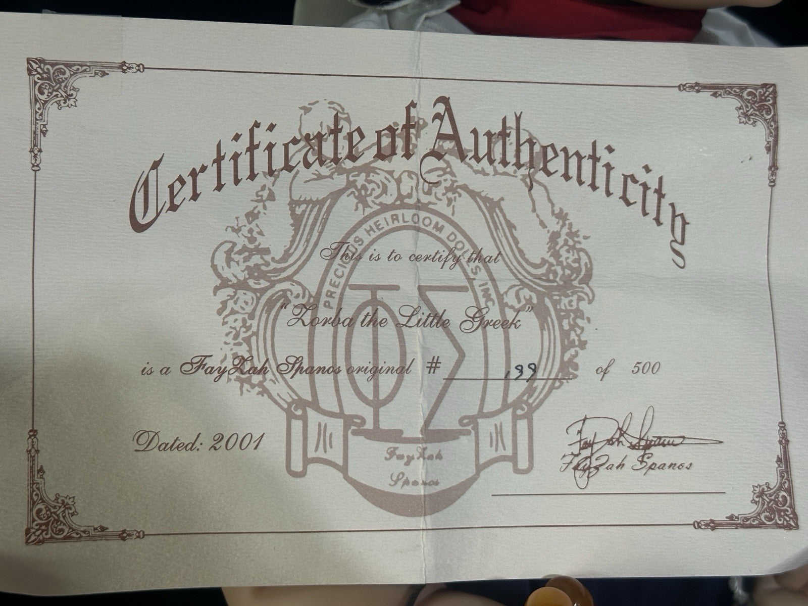 "Zorba the Little Greek" is approximately 23" tall considering a little bit bent knees. Has to be displayed in a standing position only. All vinyl. Beautiful face with stationary brown eyes and real upper and lower lashes. Some minor stains are present to his clothing. Comes with his beads but might be missing some accessories. No box or tag. Comes with COA.