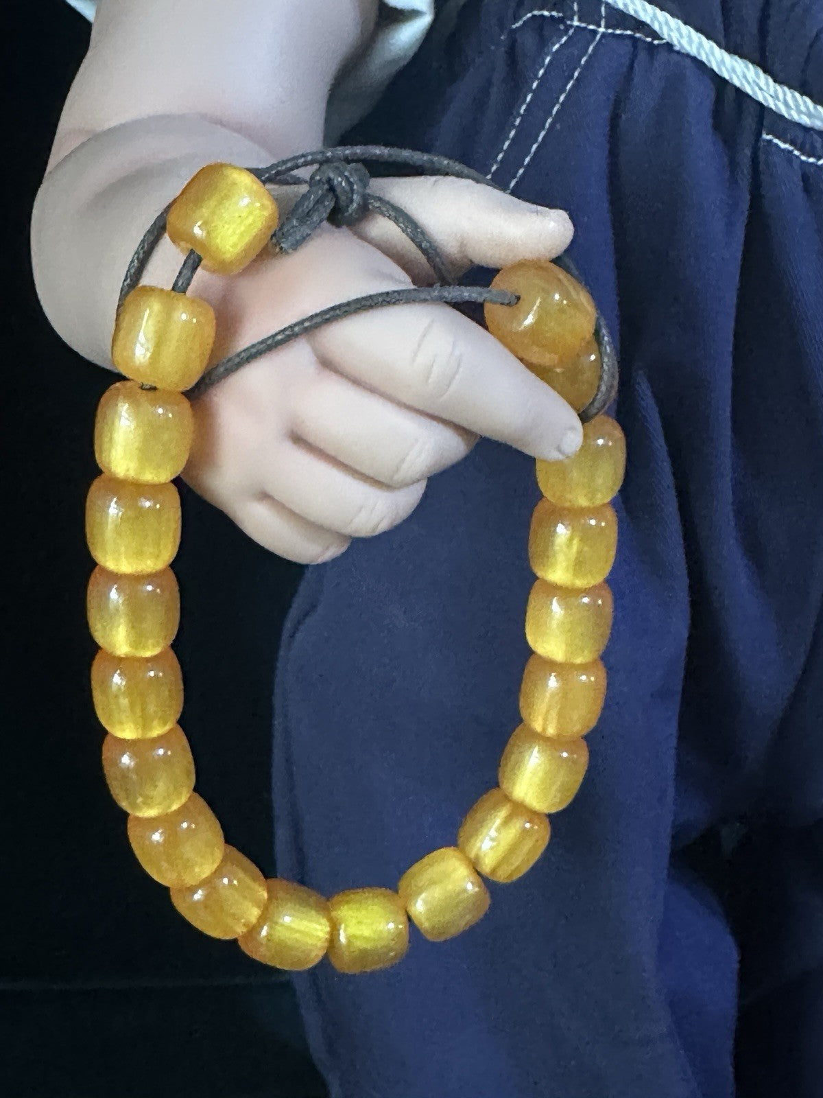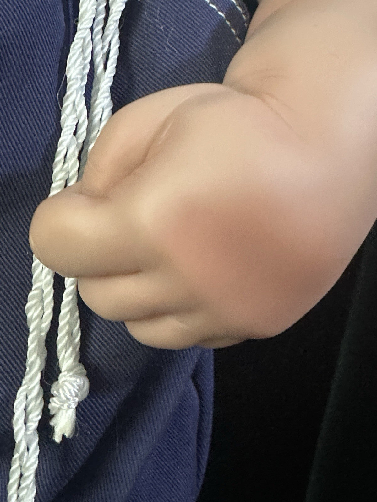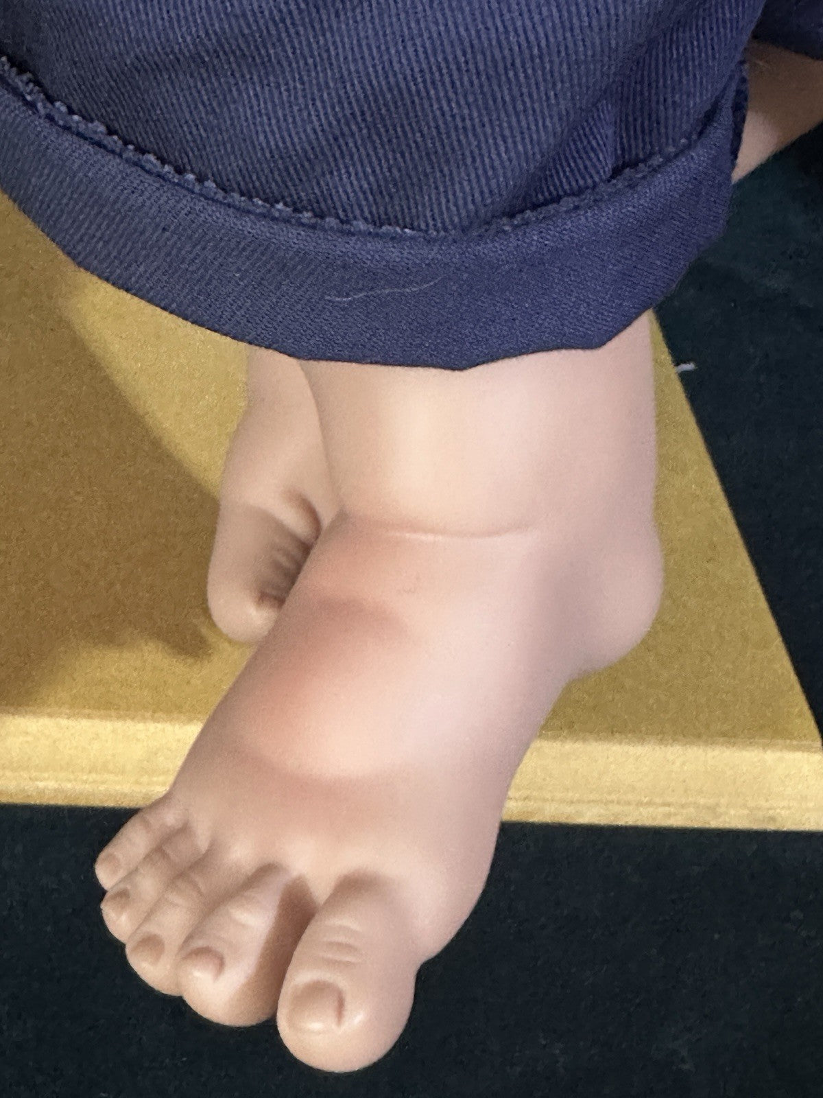 "Zorba the Little Greek" is approximately 23" tall considering a little bit bent knees. Has to be displayed in a standing position only. All vinyl. Beautiful face with stationary brown eyes and real upper and lower lashes. Some minor stains are present to his clothing. Comes with his beads but might be missing some accessories. No box or tag. Comes with COA.