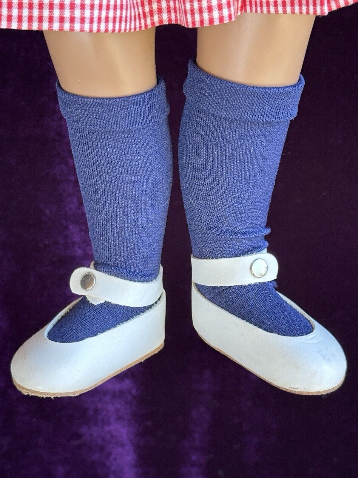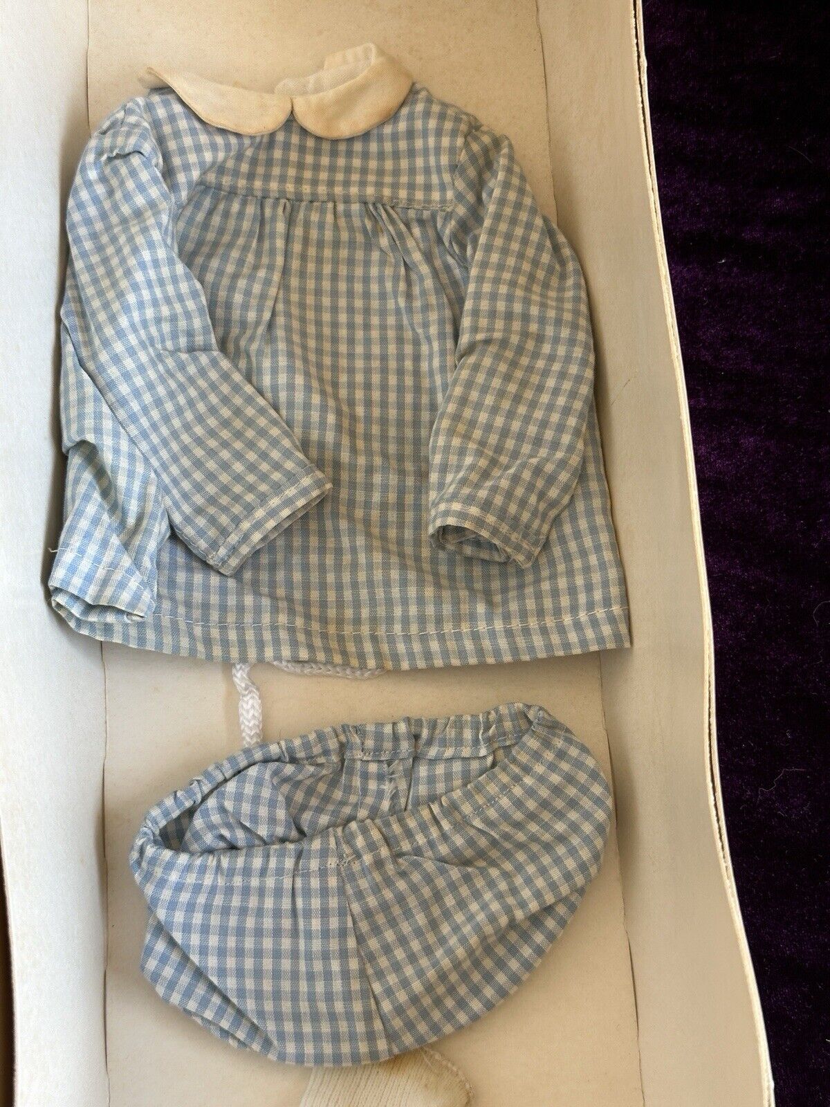 This sweet doll is coming with adorable winter outfit. Original outfit is also included, yet it has yellow stains. The doll is in good condition with light wear to her left hand. Other light wear is possible. The hair is a little messy as it was for many years under the hat. The doll is coming with original box and catalog. The box is worn.