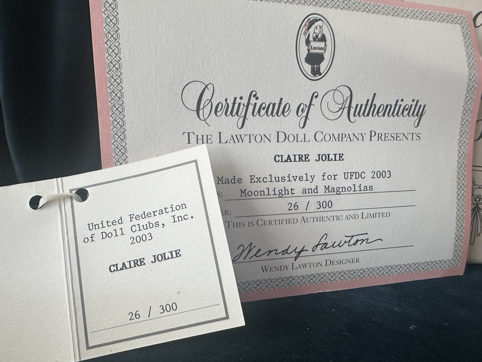 Beautiful wooden/porcelain doll by Wendy Lawton! She was created by Wendy Lawton for the 2003 UFDC Convention, "Moonlight and Magnolias," that was Held in New Orleans LA. Claire Jolie is an exclusive limited edition of only 300 dolls made. She comes with her original box, her COA, and her hang tag. She has a porcelain head and hands; fully wooden jointed body.