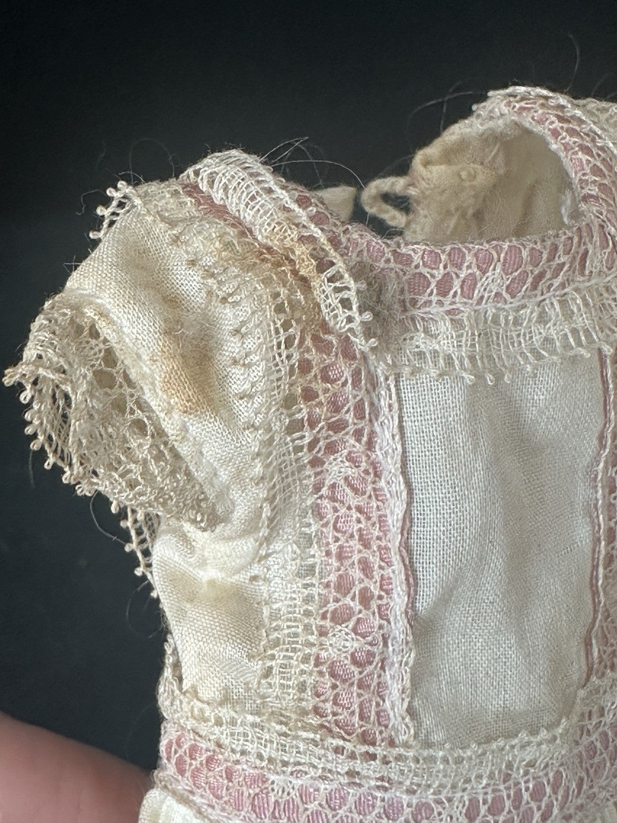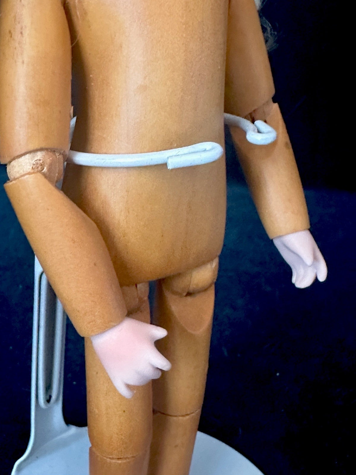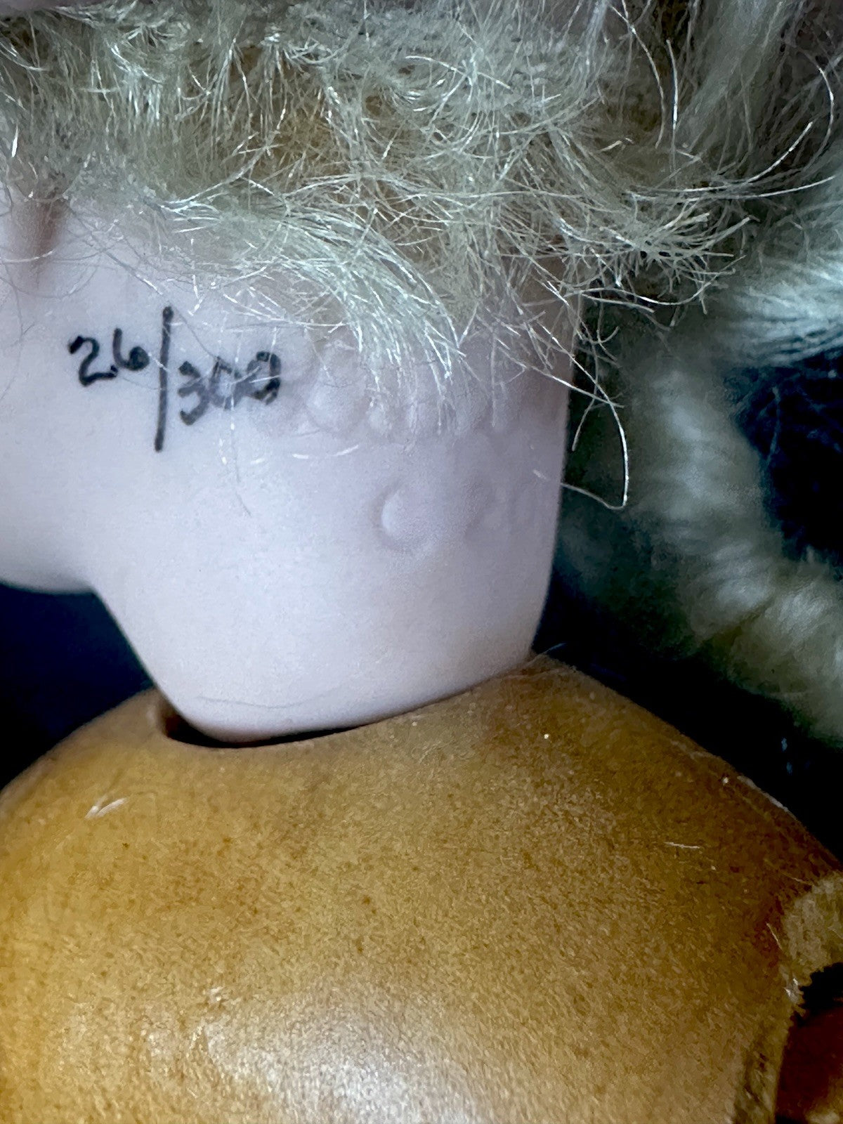 She is marked on the back of her neck. She comes with her original outfit. Stains are present to all parts of her outfit. Stand is not included.